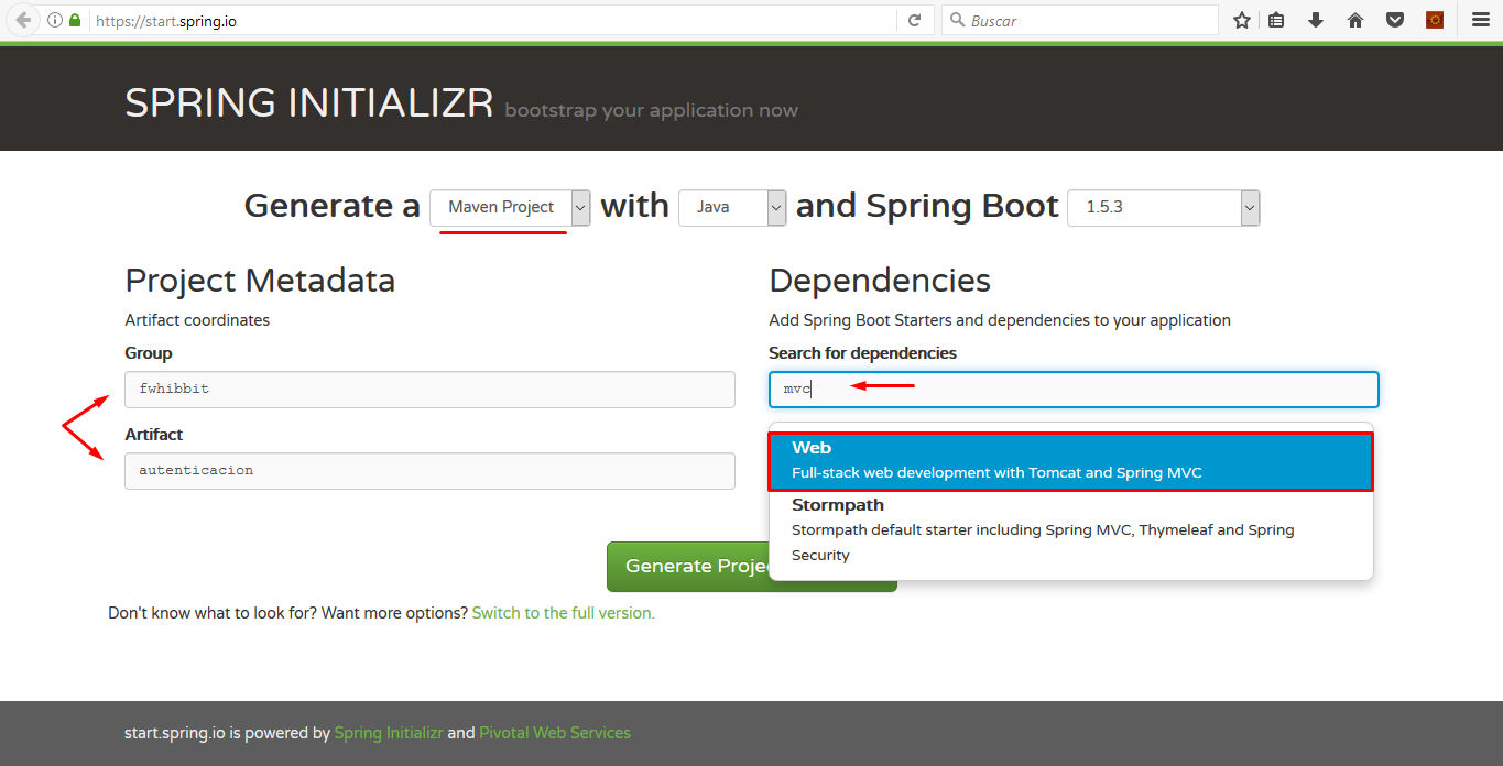 Creamos el proyecto, dándole un nombre en group y artifact y le añadimos la dependencia MVC (web).