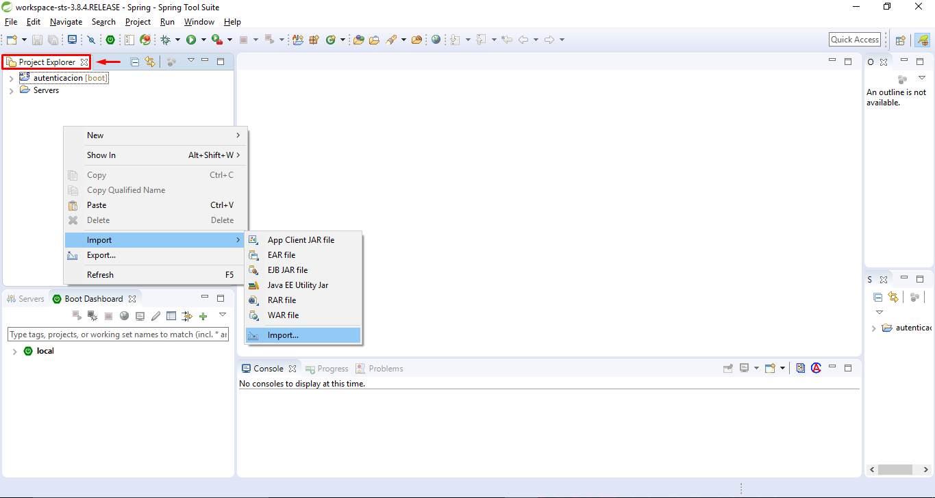 Después nos descargamos el arquetipo pulsando sobre “Generate Project”, lo descomprimimos en local e importamos sobre la herramienta Spring Tool Suite, haciendo click derecho sobre la pestaña Project Explorer > import y los buscamos en el directorio donde lo hayamos descomprimido.
