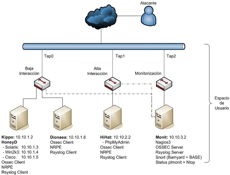 - Sebek: Alta interacción , funciona como HIDS (Host-Based Intrusion Detection System).