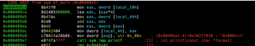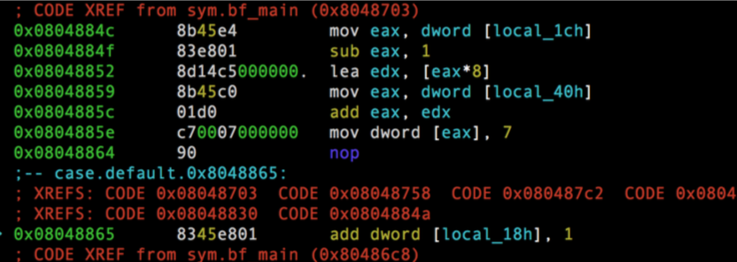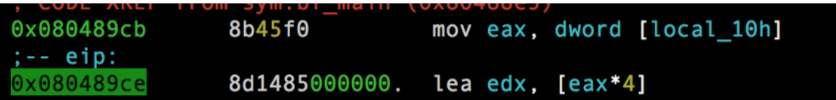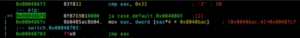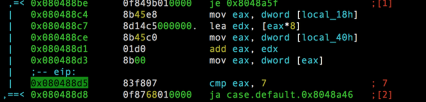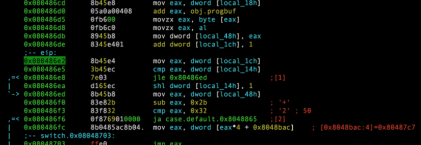 Finalmente recupera el valor 0x3e y se lo resta a 0x2b para compararlo con 0x32. Si realizamos la resta nos da 0x13 por lo tanto no saltará y en la instrucción mov eax, dword [eax*4 + 0x8048bac] realizará una operación aritmética haciendo que eax valga una dirección de memoria del código de la propia función saltando. Vemos donde salta a 0x080487fe.