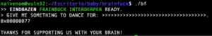 Vemos que salta ahora a una dirección de memoria diferente correspondiendo al final a una función printf y si vemos como funciona brainfuck el “.” significa que imprime por pantalla cierto valor de la pila.