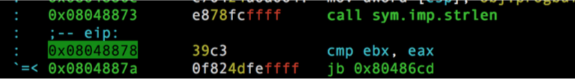 Una vez realiza el salto movería el valor de nuestro carácter > siendo en hexadecimal 0x3e a ebp-0x18.