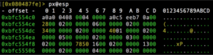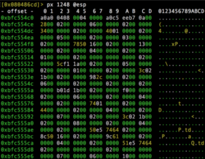 Antes de continuar quiero tener controlado el stack desde ebp hasta esp, por lo tanto si introducimos el comando px 1248 @esp vemos toda la pila justo hasta la dirección de retorno, justo al lado de ebp. Es interesante tener esto controlado porque tendremos que realizar más adelante nuestros cálculos ya que el objetivo es sobreescribir esta dirección controlando eip para poder ganar shell.