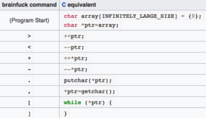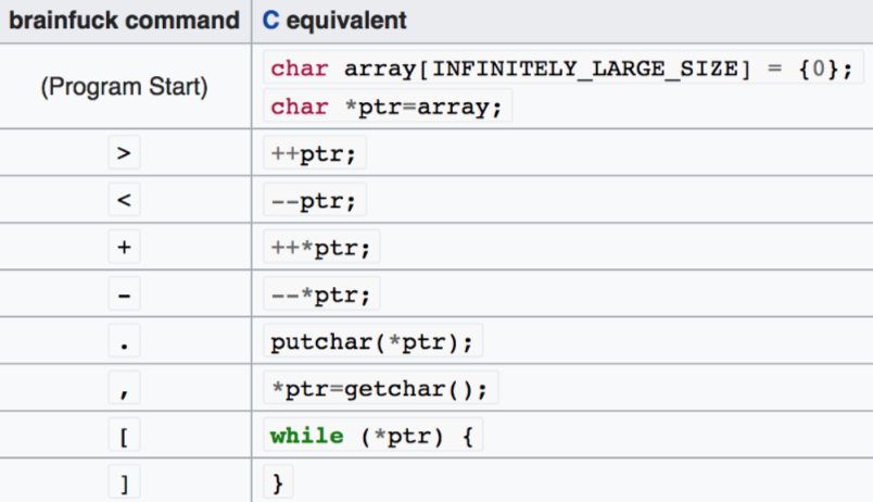 Sabemos por el enunciado se que trata de un interprete de brainfuck por lo tanto sabemos que las operaciones que va a realizar según los caracteres que introduzcamos pedidos por la función fgets() son los siguientes: