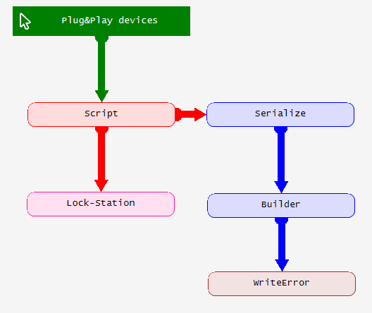 Básicamente, la primera vez que se ejecuta lee los dispositivos del archivo WhiteList.txt, y en posteriores ejecuciones, comprueba que los dispositivos estén en dicha lista, de lo contrario devolverá los dispositivos no encontrados, en caso de estar todos, finalizará el script y no llamará a las acciones descendientes de él. Si por un casual devolviese algún dispositivo no encontrado, se ejecutarán 2 acciones mas, un lock station (rundll32.exe user32.dll,LockWorkStation) y el serializado y posterior adición de la fecha y hora actual al archivo de Errores, de forma que sea mas fácil añadir a una lista blanca los dispositivos no encontrados.