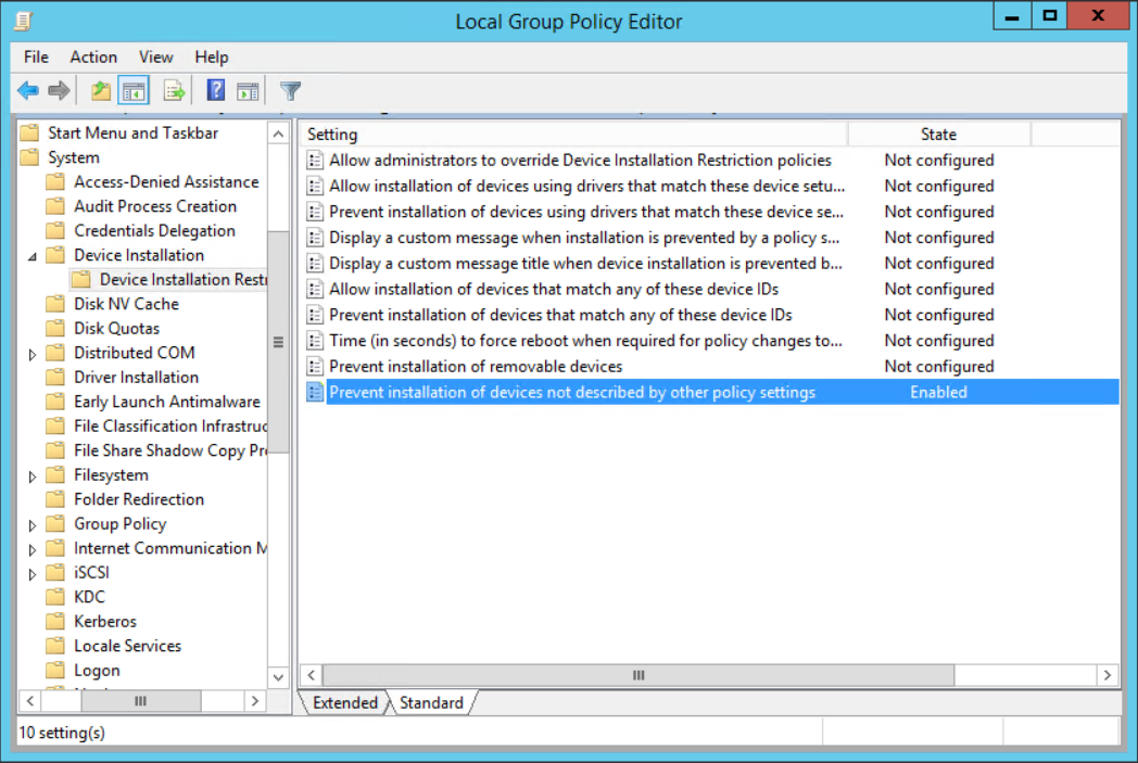 Creando una nueva política “Prevent Installation of devices not described by other policy settings” (Computer configuration → Administrative Templates → System → Device Installation → Device Installation Restriction) limitamos la instalación de nuevos dispositivos como es el caso del Rubber Ducky.