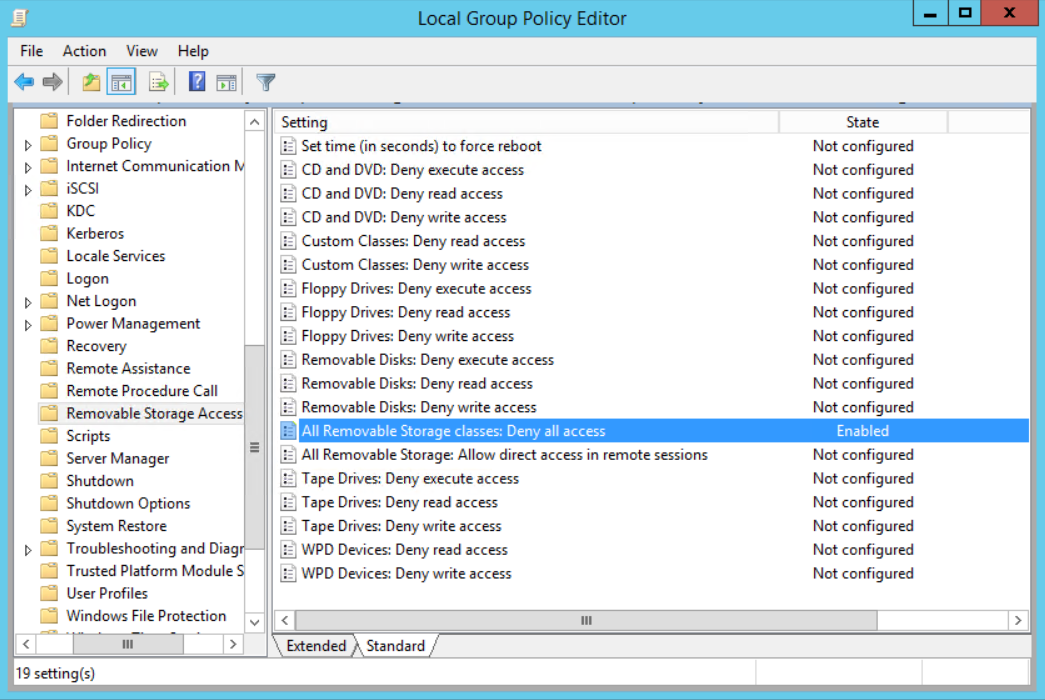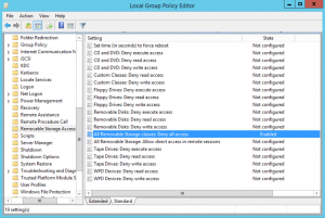 También podemos crear una nueva política “All Removable Storage Classes: Deny all access” (Computer configuration → Administrative Templates → System → Removable Storage Access) para limitar el uso de los dispositivos de almacenamiento.