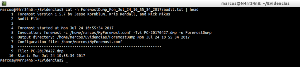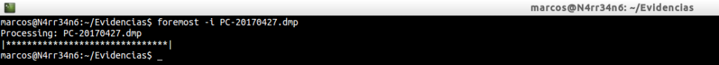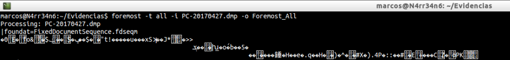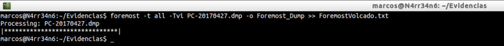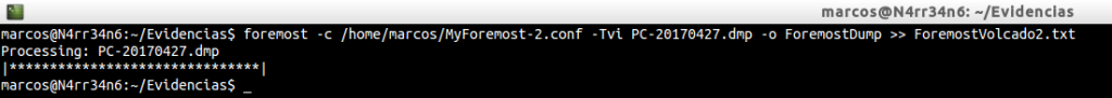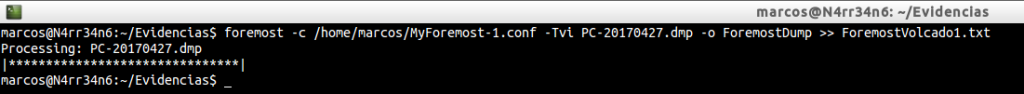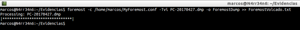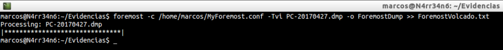 foremost -c /home/marcos/MyForemost.conf -Tvi PC-20170427.dmp -o ForemostDump >> ForemostVolcado.txt
