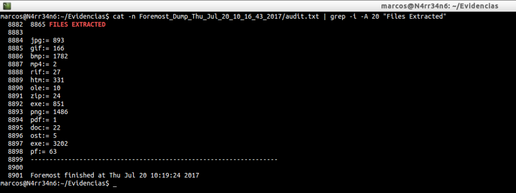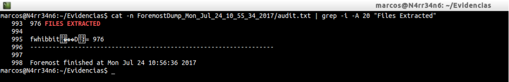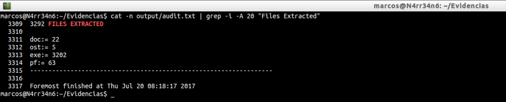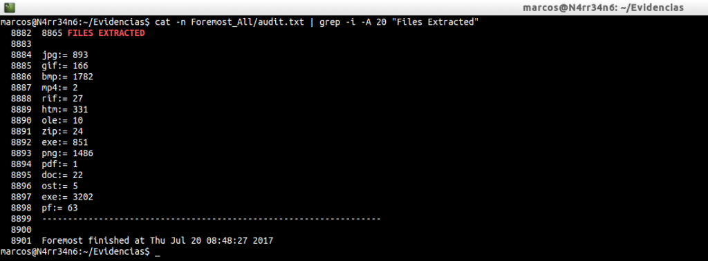 cat -n Foremost_Dump_Thu_Jul_20_10_16_43_2017/audit.txt | grep -i -A 20 «Files Extracted»
