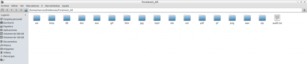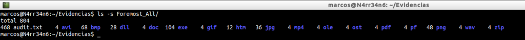 Nos ha extraído únicamente ficheros en formato ‘doc’, ‘ost’, ‘exe’ y ‘pf’. No lo considero suficiente. Tenemos muchas opciones para jugar con este estupendo programa. Y, una de ellas, es que podemos especificar tipos de archivo, o indicarle que recupere todo lo que pueda ser capaz de reconocer, (lo que tenga escrito en su ‘foremost.conf’).