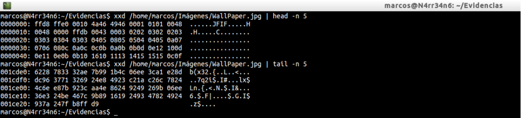 Mejor así, ¿Verdad? Fijaros en el encabezado y el pie de los ficheros ‘jpg’ que tenemos en el archivo ‘foremost.conf’ y compararlos con este de la imagen superior. ¿Coinciden? Pues así se establecen los parámetros de las extensiones.