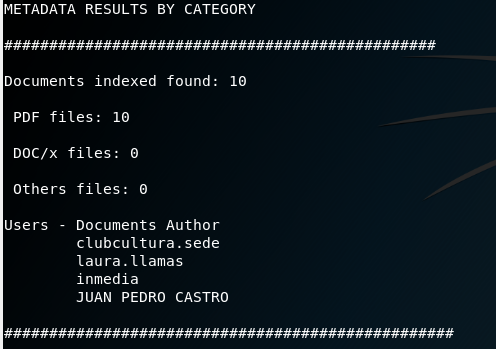 Entre los metadatos obtenidos, el enfoque se va a centrar en la obtención de nombres de usuario. En mi caso, he empleado RastLeak al tener confianza en ella pues es de desarrollo propio y tratarse de una Poc, sin embargo, lo recomendable es emplear varias y combinar resultados pues dónde no llegue una, puede llegar otra.
