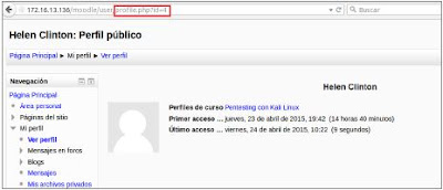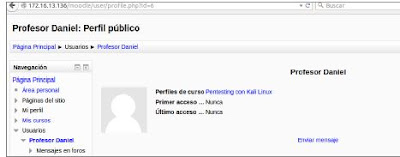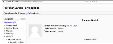Usuario con permisos accesible: Se está accediendo al perfil de un profesor que está matriculado en nuestro curso, de ahí que se pueda visualizar su perfil así como conocer el id que tiene asociado en la plataforma que es una información útil para posibles intentos de intrusión.