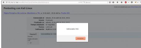 Verificando la posibilidad de XSS almacenado en los test correspondiente al módulo quiz. Adquiriendo el rol de profesor (con permisos de edición) quien tiene la capacidad de poder editar un curso para añadir foros, exámenes, noticias,…se verifica que es vulnerable a XSS.