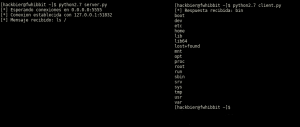 Y simplemente editamos dos líneas en el servidor. La primera crearemos la variable respuesta a la que le asignaremos el valor de peticion (mensaje recibido por parte del cliente), el cual será pasado por el método commands.getoutput, lo que hará que se ejecute como comando en el sistema y éste se alojará en la variable respuesta. Además editaremos la línea de socket_cliente.send() para sustituir la cadena «HOLA CLIENTE» por la variable respuesta anteriormente declarada.