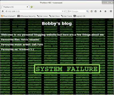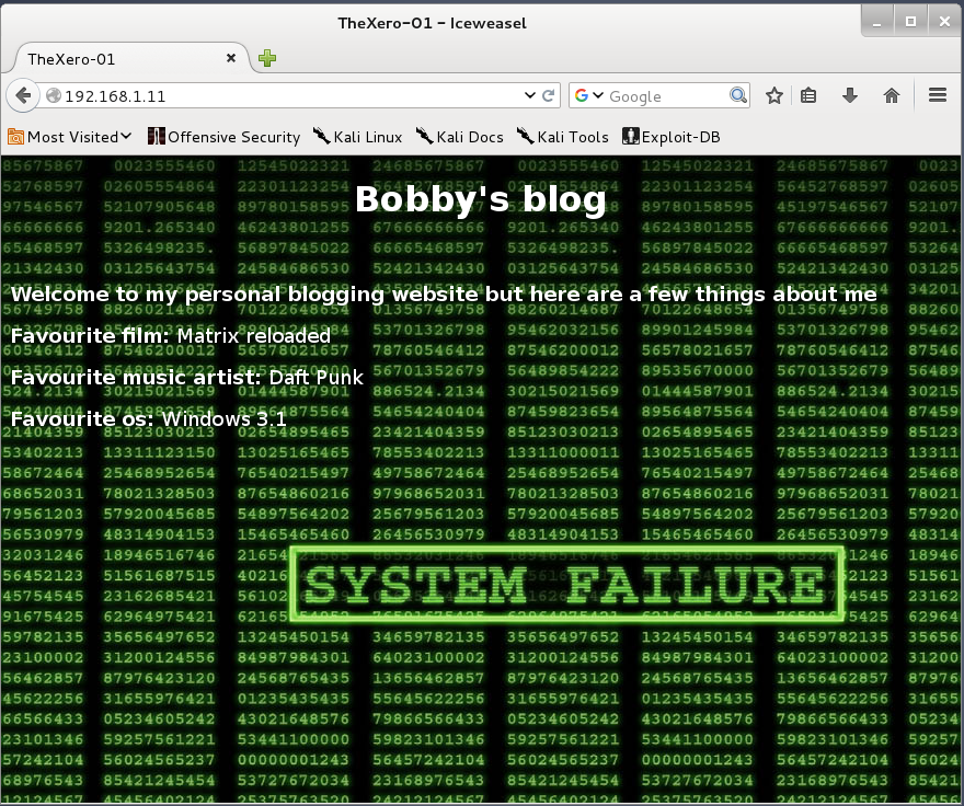 Vemos ya que hay dos servicios abiertos: un servicio web tipo IIS (servidor web de Microsoft) y un servicio FTP. Ya tenemos por dónde empezar a explorar. Si accedemos al servicio mediante el explorador web, nos encontraremos un blog personal que Bobby acaba de empezar, con algunos datos acerca de su persona: su película favorita, su grupo favorito y su sistema operativo preferido.