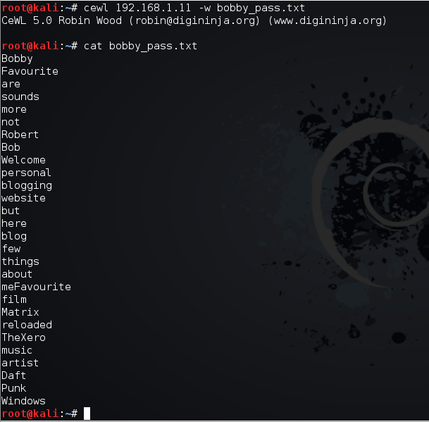 Para el diccionario de contraseñas, utilizaremos la herramienta cewl, incluida dentro de Kali Linux. Dicha herramienta lee una página web y crea un diccionario simple a partir de las palabras que encuentra en ella. Aunque no distingue mayúsculas y minúsculas, siendo el resultado un diccionario muy simple y algo inexacto, suele ser un buen punto sobre el que empezar.