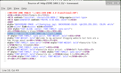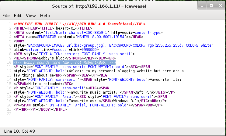 Siempre que nos encontremos una página web, se debería echar un vistazo al código fuente de la misma en búsqueda de pistas acerca de su naturaleza, comentarios del autor, etc. La experiencia puede decirnos que, al ser una página muy simple, probablemente programada puramente a mano, haya anotaciones y comentarios en el HTML. Efectivamente, podemos ver uno interesante.