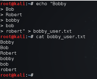 Para ello, necesitamos dos diccionarios: uno para los nombres de usuario, dado que no conocemos ninguno, y otro para las contraseñas. Para el primero, podemos intentar con uno bastante simple hecho a mano, contando con los posibles nombres de Bobby: Bobby, Bob y Robert.