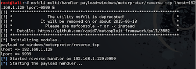 Acto seguido dejaremos a la escucha en nuestro equipo un handler de Metasploit que recibirá la conexión desde el equipo víctima. Para no tener que desplegar todo el framework, lo haremos mediante la utilidad msfcli, que simplemente ejecuta el handler de forma directa. Tendremos que especificar, nuestra IP y puerto que queremos a la escucha, así como el payload que se ejecutará.