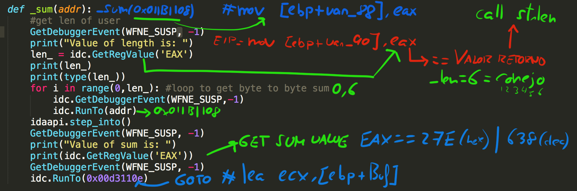 - sum(): Nos permite obtener la suma byte a byte del user introducido mediante el uso de un bucle. Primero obtiene el valor del registro EAX siendo el valor de retorno de la función strlen, coincidiendo con el número de caracteres del user introducido. Seguidamente para poder recorrer todo el bucle del desensamblado lo creo de igual modo en python e iterando hasta el último byte del user y luego ir hacia la dirección de memoria especificada por argumento. La finalidad es obtener el valor de la sumatoria byte a byte una vez haya pasado por todos ellos e ir hacía la dirección de memoria especificada.