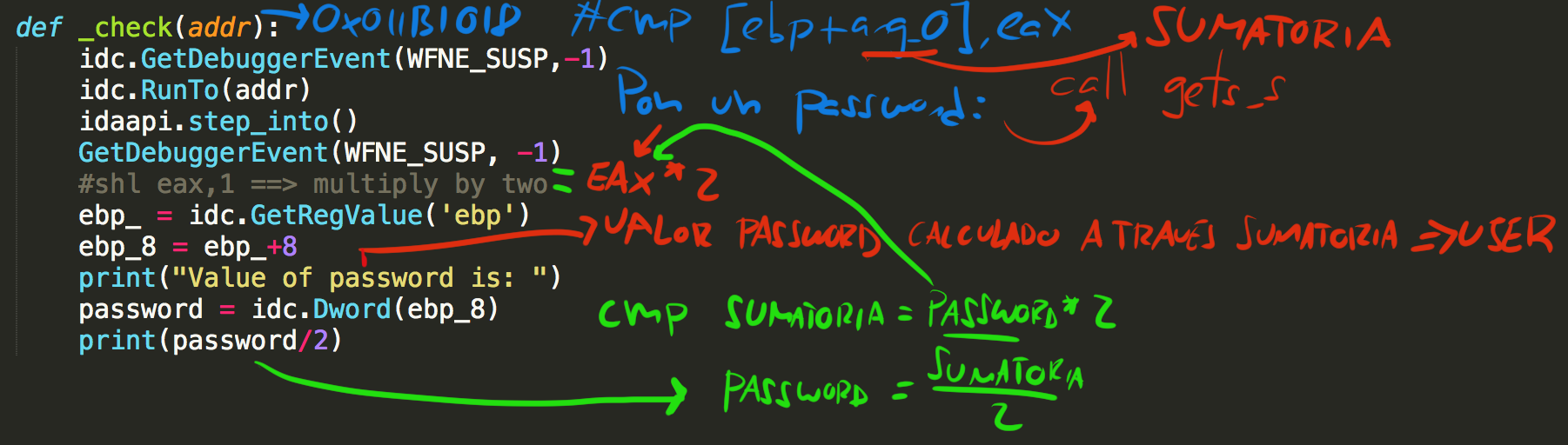 - check(): Obtenemos el valor de la password correcto según el usuario introducido. Nos dirigimos dentro de la función que checkea si la password es correcta comparando el registro EAX*2 siendo la password introducida por el usuario y el valor sumatoria. Si sabemos que el valor password introducido es EAX, luego EAX vale el doble (debido a shl eax,1) y también sabemos el valor de sumatoria, es despejar la ecuación dividiendo sumatoria/2.