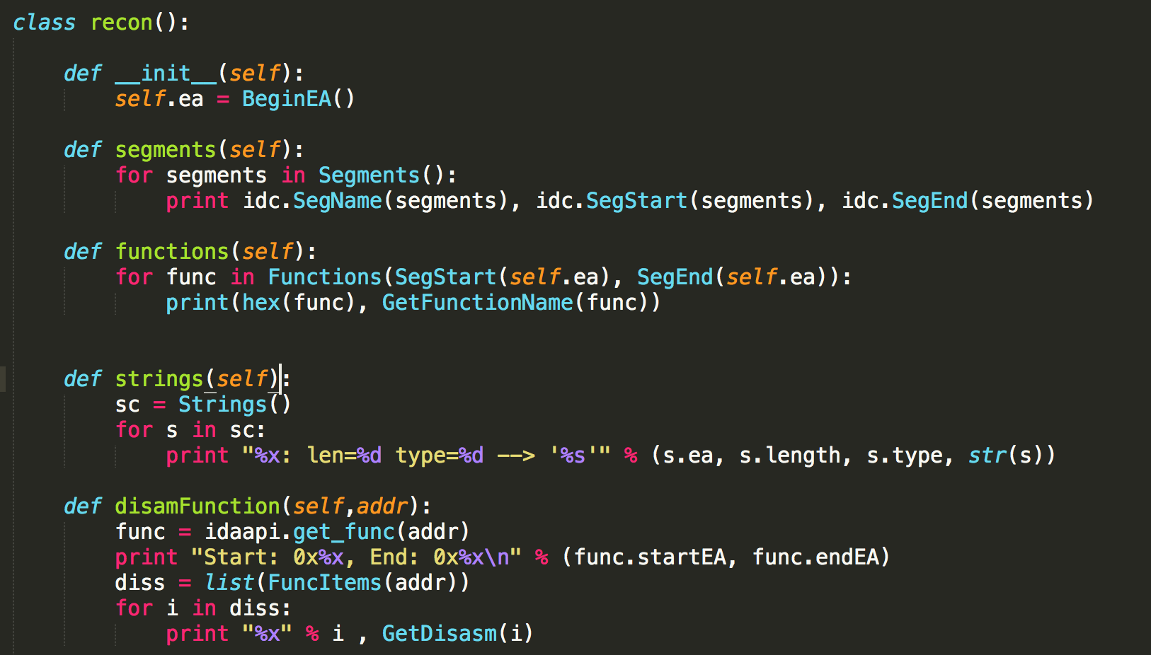 Es muy interesante si vamos creando nuevas clases y métodos siendo creativos y echándole imaginación a todos los binarios que apliquemos reversing, podamos encontrar patrones similares a fin de poder automatizar nuestras tareas. En dos crackmes realizados hasta la fecha de hoy usando la api de IDA, he podido identificar ciertos patrones para poder crear dos clases (recon y discover) facilitándome la tarea de ingeniería inversa.