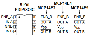 - Un circuito integrado MCP14E4-E/P o similar que permita manejar los motores. Aquí tenéis un esquema del integrado sacado de la documentación: