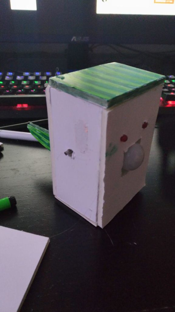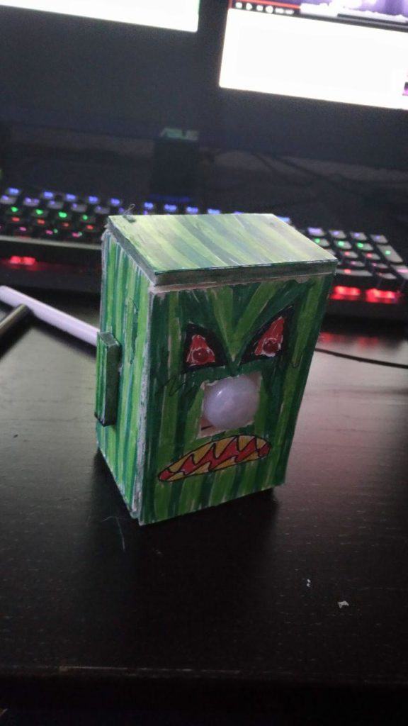 En vez del zumbador podría tener un motor normalito de los baratos con unas palas de cinta que golpeen el cartón pluma para hacer un ruido raro. A la gente le da miedo los ruidos raros.