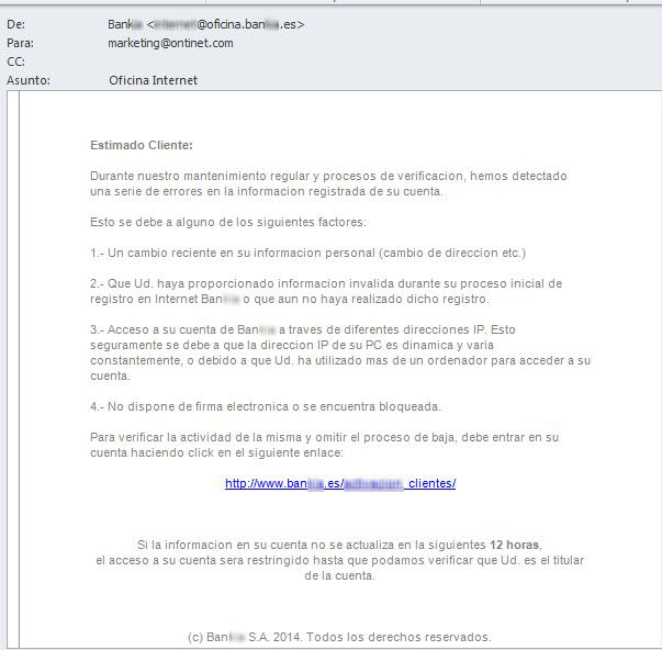 El texto esta bastante bien redactado en un español correcto (a falta del logo del banco…), realizando igual que en el ejemplo anterior una estafa al usuario pidiéndole sus datos personales mediante un enlace malicioso perfectamente camuflado «aparentemente».
