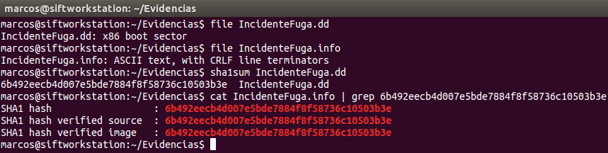 Una vez hubo completado este proceso de adquisición del disco duro, se aseguró de que las dos imágenes generadas, (Volcado de memoria y Disco Duro), estuvieran correctas.