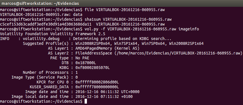 Con el volcado de memoria, hacemos lo mismo. Primero le pasamos el comando ‘file’ al fichero de imagen. Después, usamos Volatility, (Existen varias opciones para instalar este Framework),  e identificamos tanto su sistema, a través de ‘imageinfo‘, como su fecha de adquisición.