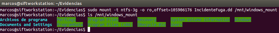 sudo mount -t ntfs-3g -o ro,offset=105906176 IncidenteFuga.dd /mnt/windows_mount