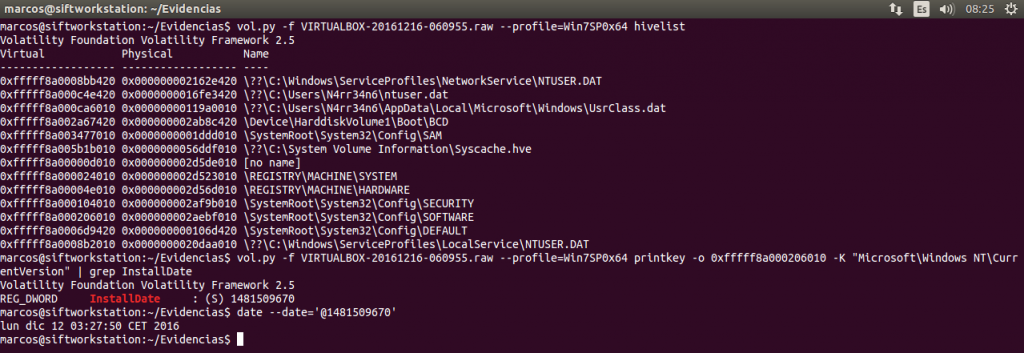 vol.py -f VIRTUALBOX-20161216-060955.raw –profile=Win7SP0x64 printkey -o xfffff8a000206010 -K «Microsoft\Windows NT\CurrentVersion» | grep InstallDate