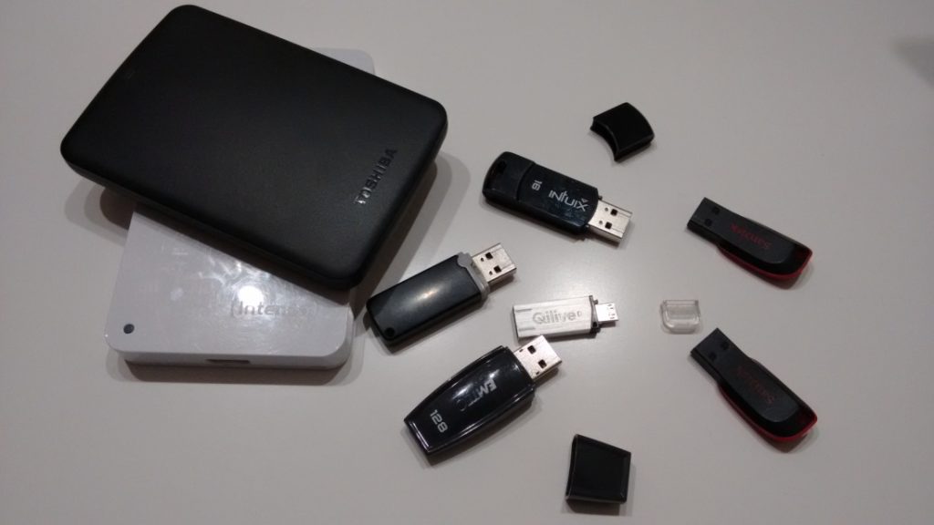 Os adelantaré que, para simular este caso, conecté estos ocho dispositivos de la imagen de abajo. Primero conecté los seis Pendrives. Antes de la intervención, que se hizo con el disco duro blanco Intenso, procedí a conectar el disco duro negro Toshiba, (Con el que me llevé del sistema un fichero de imagen), por lo que va a ser ese el que nos interese identificar.