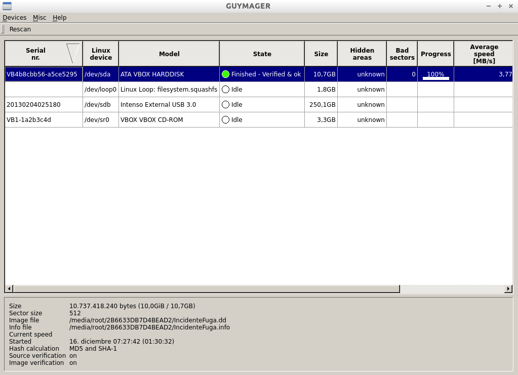 Una vez se aseguró de que la imagen del volcado de memoria se generó de manera satisfactoria, desconectó el Sistema directamente del cable de alimentación y procedió a la adquisición en bruto del disco duro, usando para ello la herramienta Guymager.