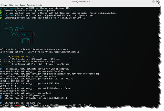Pero básicamente el procedimiento es el mismo. La elección de un payload y su correspondiente exploit. Herramientas como Veil-Evasion permiten la creación de payloads y poder usarlo con el exploit/multi/handler de Metasploit a la espera de la conexión (o payload) inversa dada una dirección IP pública o privada y un puerto determinado.