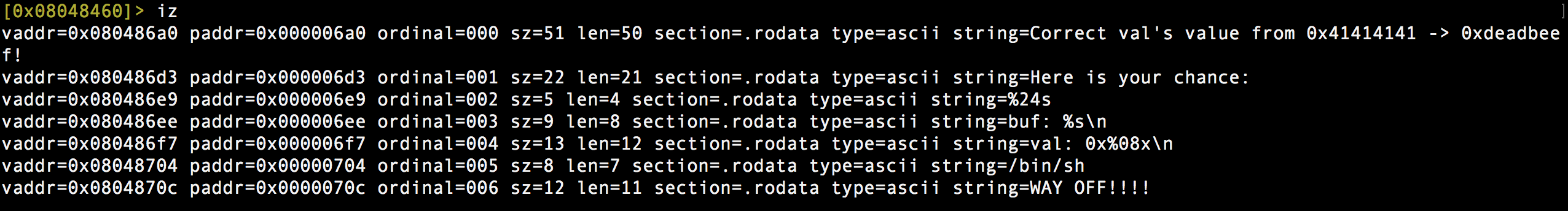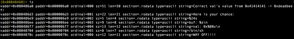 Podemos ver en las strings algo muy raro visualizando el valor de la variable «val», pero ya sabemos que su valor en el código fuente es 0x41414141, ¿que sentido tiene que me lo visualice? Quizás sea cómo es el valor que se compara con 0xdeadbeef, necesitamos sobreescribir esa variable con ese contenido para obtener la shell!. Entonces me diréis ¿para que vamos a trabajar de más viendo el código desensamblado y debuggearlo, si ya tenemos un leak de información que nos muestra el contenido de la variable a sobreescribir? Pues si, es trabajar de más porque es muy sencillo ya que es ir probando hasta dar con la cantidad de caracteres del buffer que sobreescribe la variable y así bypassear la estructura de control y ganar la shell. Pero como ami me gusta hacer las cosas bien, obviamos esa «ayuda» o leak de información y primero lo analizamos estáticamente y posteriormente dinámicamente haciendo debugging. Comenzamos con las primeras instrucciones en el desensamblado: