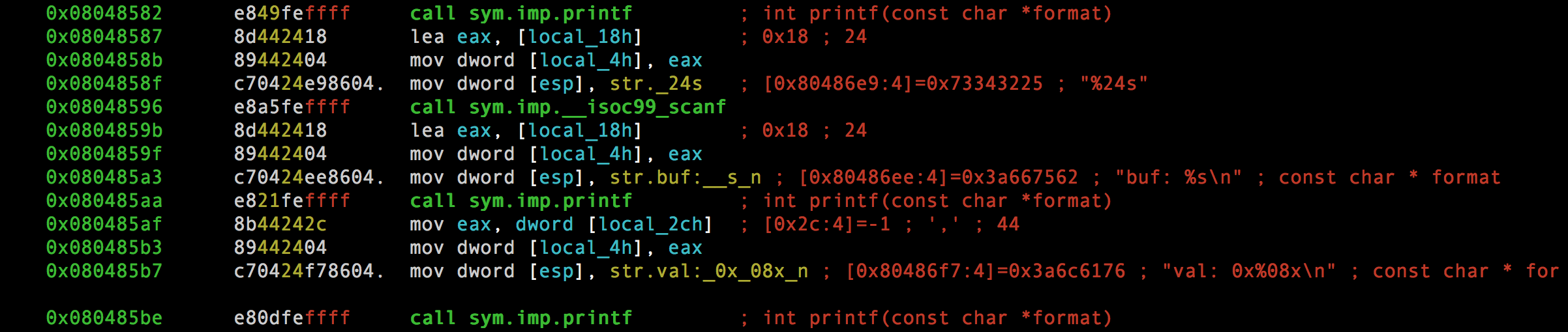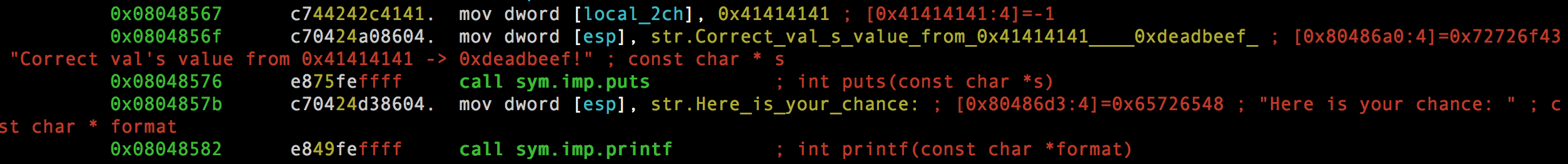 La variable local_2ch es nuestra «val». En esas instrucciones llama a la función puts() y printf() que básicamente lo que hace es mostrar por la salida estándar los caracteres de las strings.