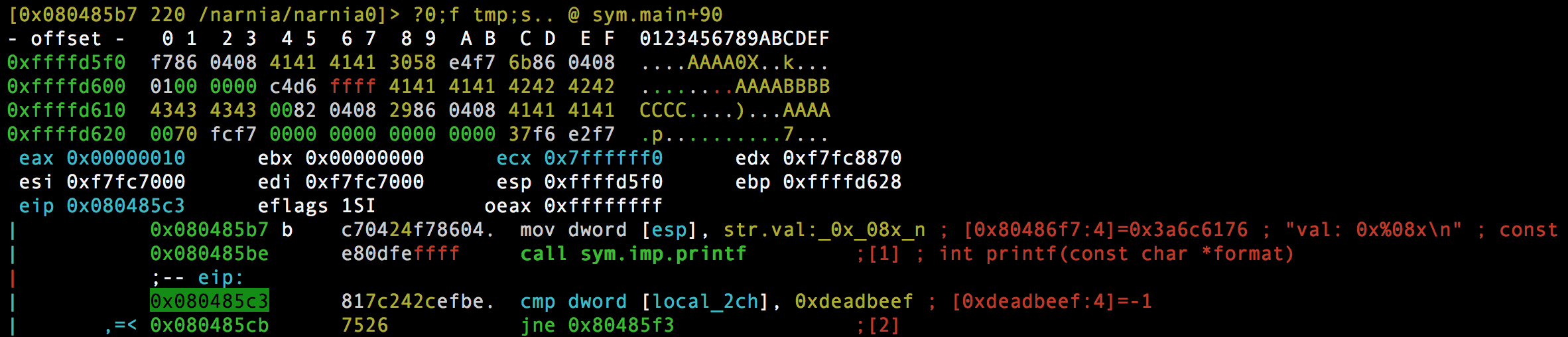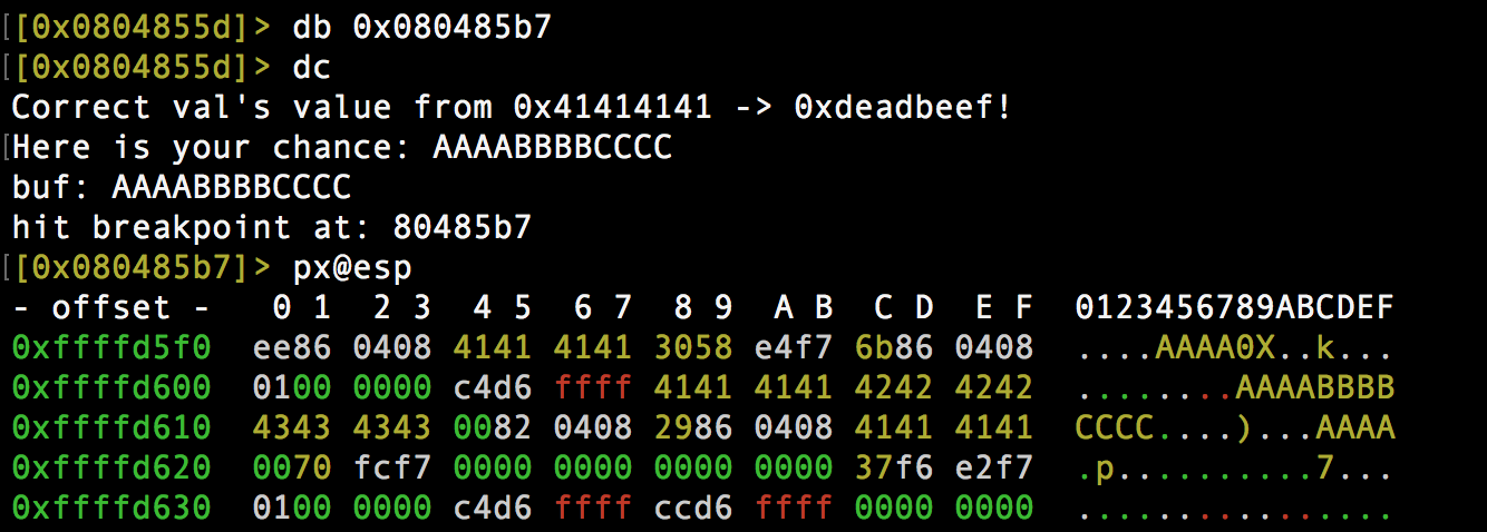 Ahora viene la parte mas entretenida :). Comencemos por introducir por stdin «AAAABBBBCCCC». Colocamos un breakpoint con «db» justo en la dirección de memoria cuando el registro ESP contiene la dirección de memoria que contiene el valor de «val».