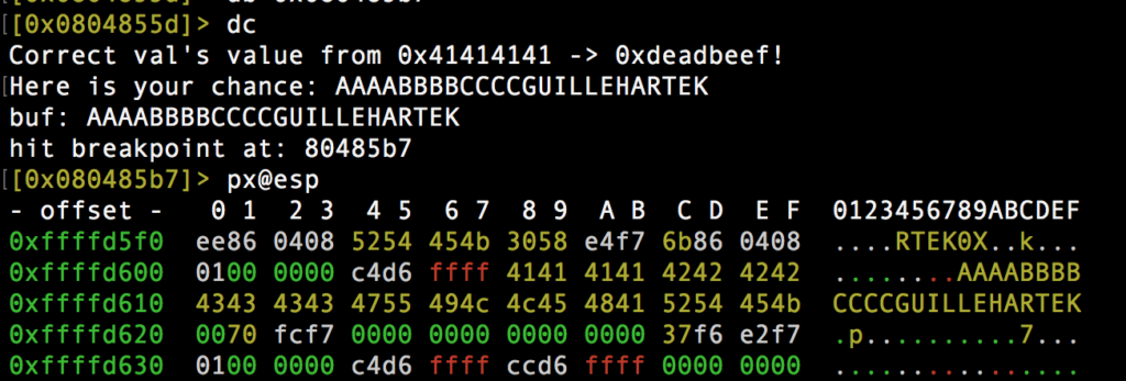 Y ahi esta mi amigo del blog Guille Hartek machacando el contenido de «val»! Gracias a esta variable que nos mostraba ese leak de información por pantalla al ejecutar el binario sabemos exactamente la posición en memoria de los bytes que se necesita «RTEK» justo a partir del 20: