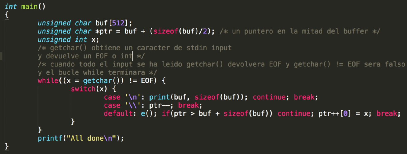 Seguidamente vemos un bucle while en el cual llama la función getchar(). Esta función obtiene un valor de stdin y se compara con EOF.