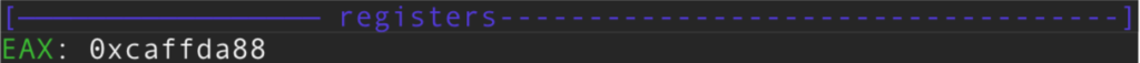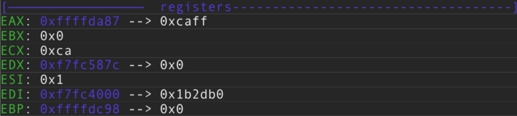 Vemos que ha escrito con \xca. Si nos fijamos era ir jugando con el decremento y ajustarlo justo en 0xff y escribir en el. Escribir podemos escribir en cualquier sitio dependiendo de donde pongamos el puntero al decrementarlo pero hay que ajustarlo para que coincida la escritura justo en el mismo sitio en el STACK donde contiene esa dirección. Vemos que EAX vale: