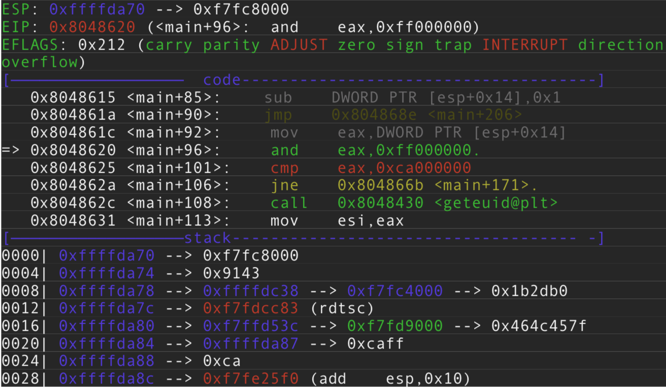 Colocamos un breakpoint en 0x08048620 justo en la operación AND y enviamos seguidamente por input al binario: