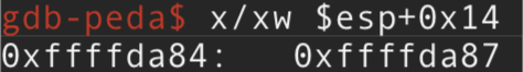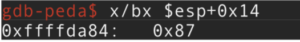 Es decir el contenido de ESP+0x14 por tanto es: 0xffffda87 y la dirección de memoria donde esta almacenado (contenido) el puntero es 0xffffda84, lo vemos en el STACK: