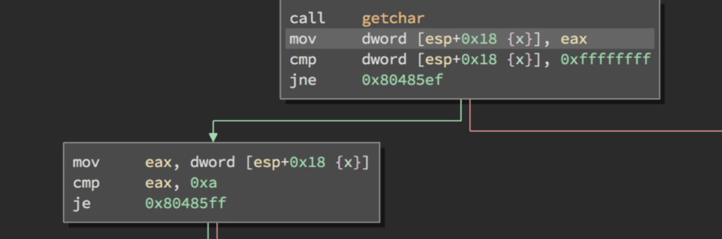 Renombramos la variable a “x”. Con la instrucción MOV moverá el contenido del registro EAX que será el valor de retorno de la función getchar() a ESP+0x18 en el Stack donde se encuentra la variable “x”.